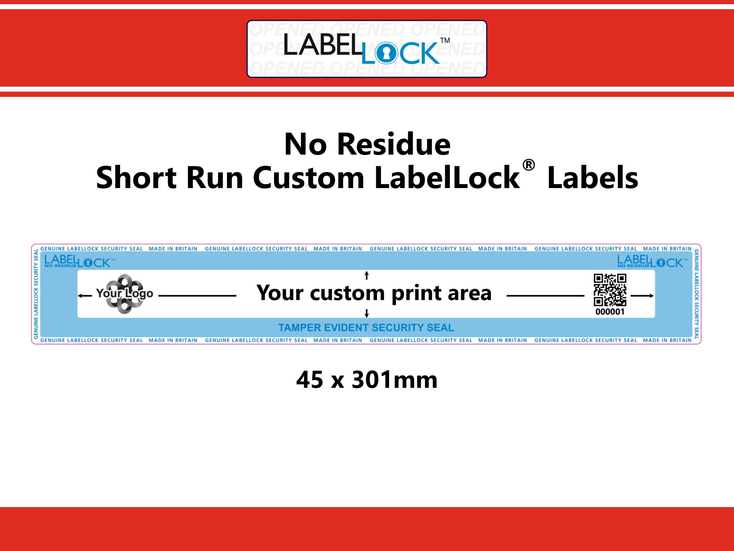 - Providing all of the same key security features as standard LabelLock® with the ability to customise content (in black ink only) within the central white background area of the label, from quantities as low as 1,000.